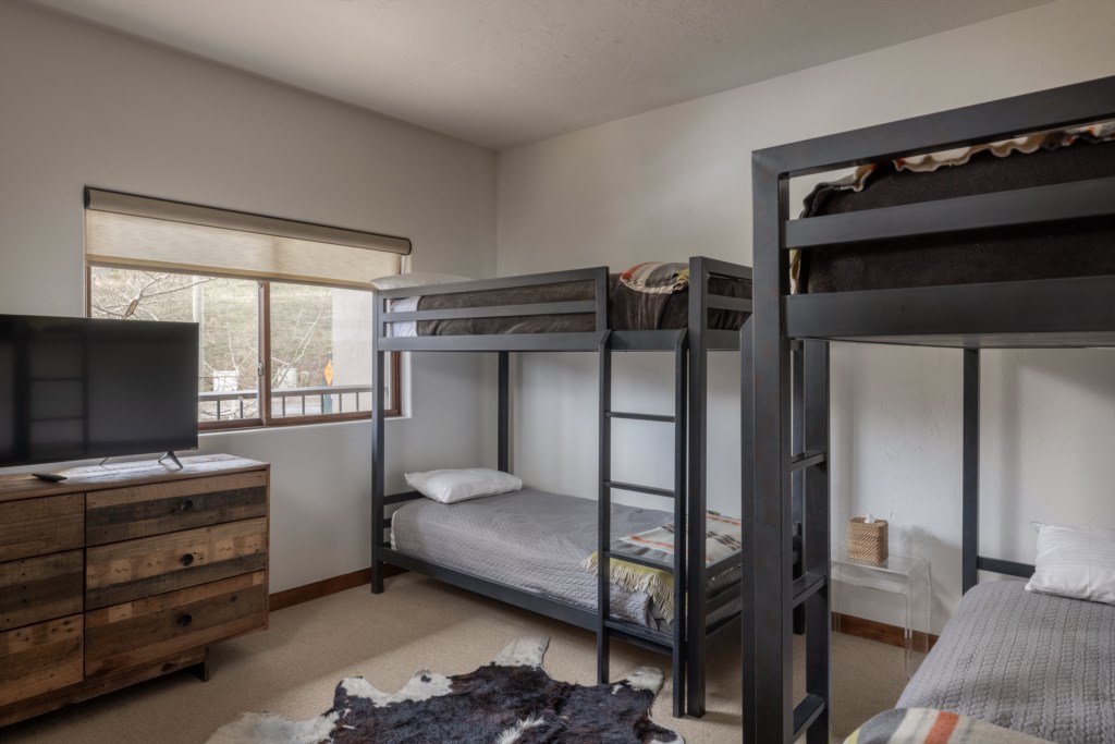 - A queen bedroom and a bunk room with two twin bunk beds—ideal for families or larger groups